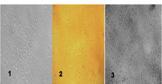 Cytopathic effects of NDV in CEF cells: 1) 24 hpi, 2) 72 hpi 3) control