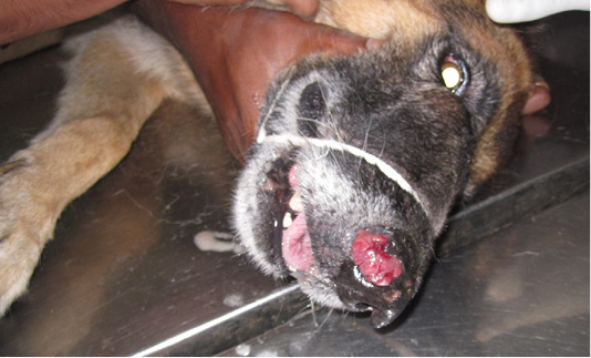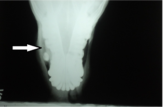 Radiography of rostral view revealing a radio opaque mass (arrow) in the right nostril