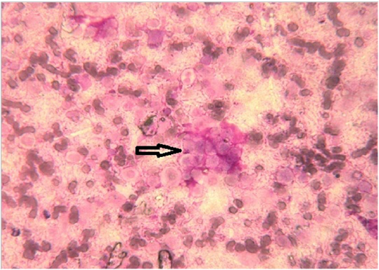 Cytology picture showing clusters (arrow) of chondrocytes (Leishman’s stain×1000)