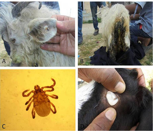 Animals affected with ticks on different body parts (A, B); Haemaphysalis spp. removed from different body parts (C); pale mucus membranes visible (D)