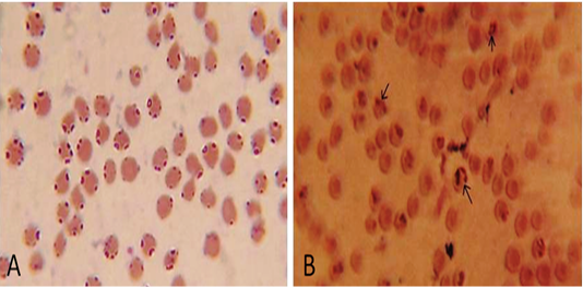 Microscopic examination of Giemsa-stained blood smears showing presence of intra-erythrocytic Babesia ovis (A) and Babesia motasi (B) (1000x)