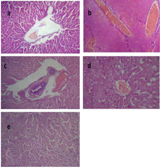 Liver of group (II) showing congested central vein and dilated hepatic sinusoids (a) (H&E ×400). Liver of group (III) showing severe congestion of the central veins (b). Cholangitis represented thickening of the bile duct wall by vascular congestion, edema and leukocytic infiltration besides cholestasis (c) (H&E ×100).Vacuolation of the hepatocytes (d) (H&E ×400).Liver of group (IV) showing interstitial hemorrhage and normal tissue architecture (e) (H&E ×520).