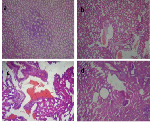 Kidney of group (II) showing focal leukocytic aggregation in the renal medulla (a) (H&E ×400). kidney of group (III) showing vascular congestion and hemorrhage (b) (H&E ×400) with fibrous connective tissue proliferation (c) (H&E ×100). Kidney of group (IV) showing cystic dilatation of few renal tubules, renal casts, hydropic degeneration of the epithelial lining of some renal tubules and vascular congestion (d) (H&E ×400).