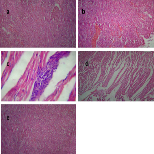 Heart of group (II) showing mild congestion of cardiac blood vessels (a) (H&E ×400). Heart of group (III) showing sever vascular congestion (b), leukocytic infiltration between the myocardiocytes (c) and intermuscular edema (d) (H&E ×100). Heart of group (IV) showing mild congestion of cardiac blood vessels (e) (H&E ×400).