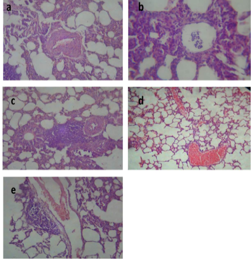 Lung of group (II) showing slight congestion of thickened pulmonary blood vessels (a) (H&E ×520). Lung of group (III) showing pneumonic area represented by thickening of the interalveolar septa by extensive leukocytic infiltration mostly polymorphonuclears (b) (H&E ×400), peribronchial lymphoid hyperplasia (c) and severe vascular congestion (d) (H&E ×100). Lung of group (IV) showing vascular congestion with perivascular leukocytic aggregation (e) (H&E ×100).