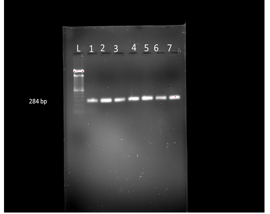 L- Marker Ladder of 100bp, 1- Positive sample, 2, 3, 4, 5, 6 and 7 Salmonella isolates