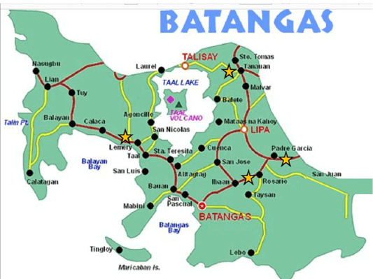 Map of the province of Batangas showing the four municipalities were the study was conducted. LBMs in the study were marked with a star