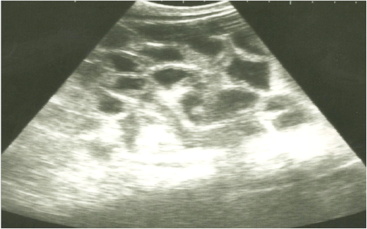 Ultrasonographic image of the left abdomen of horses with colic associated with enteritis and/or colitisusing 3.5 MHz transducer. The intestinal loops appear distended with fluid contents; the intestinal wall is slightly thickenedand corrugated. Increased intestinal motility of the intestinal loops was detected on the screen.