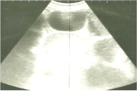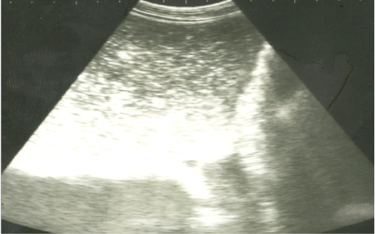 Ultrasonographic image of the left abdomen of horses with colic associated with impaction of the intestine using 3.5 MHz transducer. The intestinal loops were distended with fluid and food particlesand prominent signs of ileus.