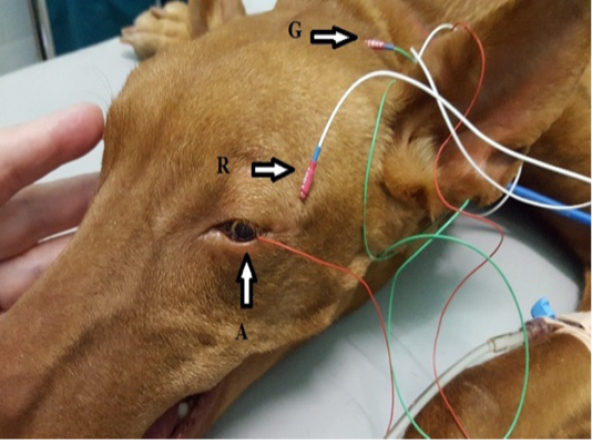 Position of the electrodes for ERG examination. A-active electrode in lens shape put on the cornea, R-reference needle electrode put on 1 cm of lateral eye border, G-ground needle electrode put on the external occipital protuberance.