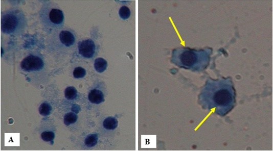 A) Bone marrow cells of control rats Rattus rattus, Bandicota bengalensis and Tatera indica with no micronucleus B) Bone marrow cells of different species of rats clearly showing the increase in number of micronucleated cells.