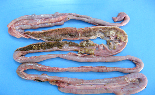 Intestinal mucosa showing diffuse necrosis and pseudomembrane which forming a dirty turkey towel appearance.