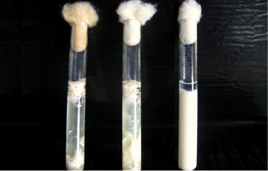Milk medium showing the classical stormy clot reaction of C. perfringens.The tube on the left extreme is uninoculated.