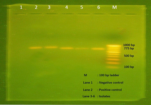 Agarose gel electrophoresis showing 775 bp amplicon of alpha toxin gene of C. perfringens. Lane M- 100 bp DNA ladder, Lane 1- Negative control, Lane 2- Positive control, Lane 3-6 – Isolates positive for C. perfringens.