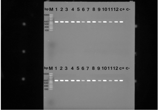 PCR products for nuc gene of Staphylococcus aureus strains showing amplified genes at the expected molecular size 660 bp from lane (1-12) and the last two for positive and negative controls, respectively.