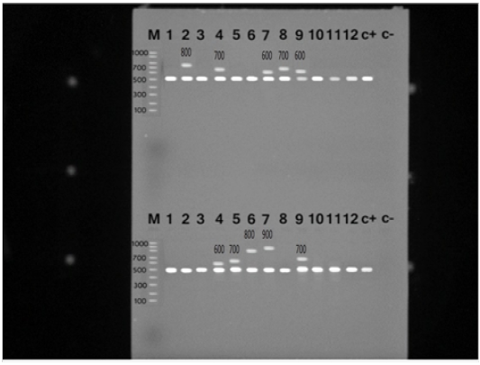 PCR products for coa gene of Staphylococcus aureus strains showing amplified genes at the expected molecular size 500-1000 bp from lane (1-12) and the last two for positive and negative controls, respectively.