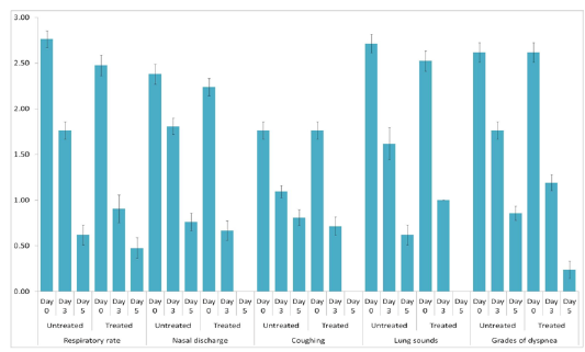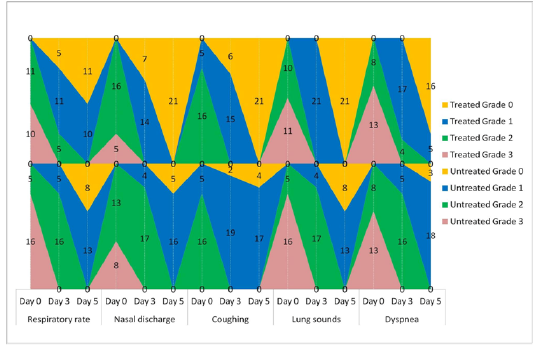 Frequency-distribution of animals according to grade of respiratory parameter. Values indicate the number of animals falling under a grade on the specified day of study.