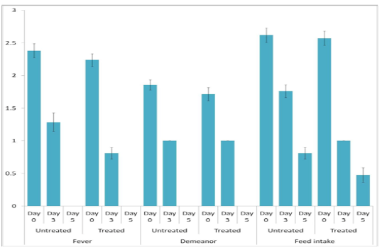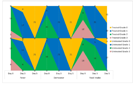 Frequency-distribution of animals according to grade of clinical parameter. Values indicate the number of animals falling under a grade on the specified day of study.