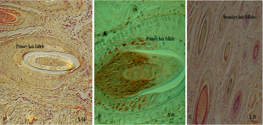 Shows DICM image of primary hair follicle (A. X10; B. X 40; C. X20)