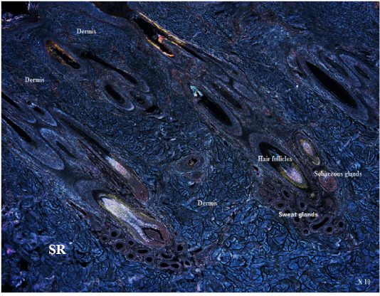 Shows DICM image of the dermis layer , SR: Stratum reticular (X10)