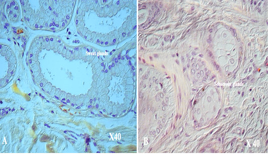 Shows DICM image of A. sweat glands ( X 40); B. Sebaceous glands (X 40)