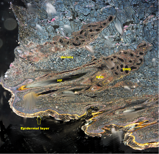 Shows DICM image of the skin of the camel revealing all layers of the skin (X10). HF: Hair follicle; SWG:Sweat glands; SEG: Sebaceous gland