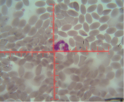 Shows sex chromatin type Sessile nodule, the horizontal and vertical dimension measurements in the nucleus of the neutrophils (x1000)
