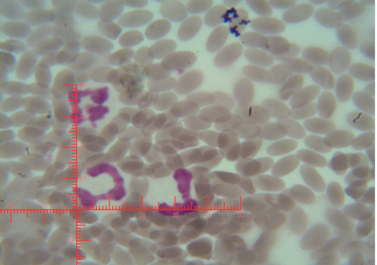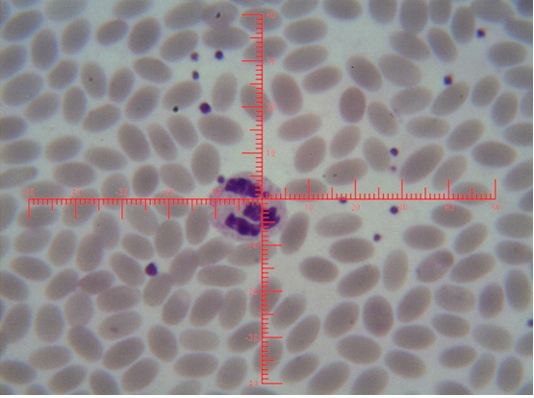 Shows sex chromatin type tears drop, the horizontal and vertical dimension measurements in the nucleus of the neutrophils (x1000)