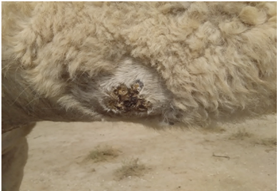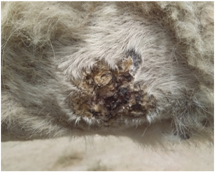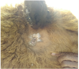 Dermatophilosis lesion in abdomen lesions show hairless brownish crusts with irregular sizes and pus exudation.