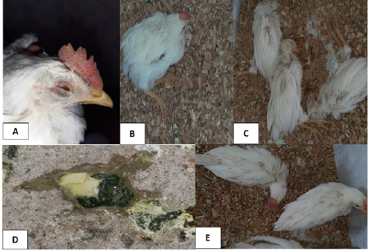 Clinical signs observed in the infected group at 4th and 5th days post- infection (dpi). A, foamy conjunctivitis and periorbital edema were observed at 4th dpi; B, neurological signs (leg paralysis) were observed at 4th dpi; C, sudden high mortalities were observed at 4th dpi; D, greenish lose droppings were observed at 5th dpi; E, neurological signs (torticollis) were observed at 5th dpi.