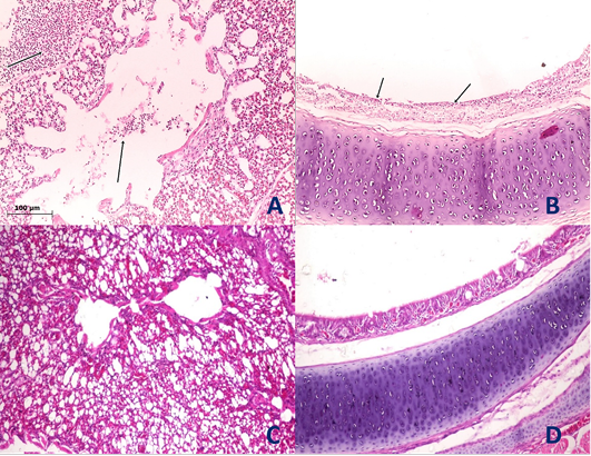 Histological section of lung and trachea of the infected and non-infected group at 5th day post infection (dpi). A, lung showed moderate pneumonia with inflammatory exudate inside tertiary bronchi and secondary bronchi (arrow) with necrosed tertiary bronchi lining; B, trachea revealed tracheitis with noticeable necrosis of lining epithelium and mononuclear cells infiltration (arrow); C, normal lung (non-infected group) with no histopathological alterations; D, normal trachea (non-infected group) with no histopathological alterations.