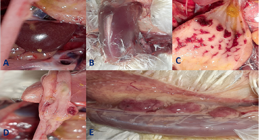 Gross pathological lesions observed in the infected group at 4th and 5th days post- infection (dpi) up on postmortem examination. A, Enlarged mottled spleen; B, severe muscle congestion; C, severe hemorrhages on the tips of periventricular glands; D, hemorrhagic ulcers on cecal tonsils; E, severe congestion with hemorrhages on the thymus gland.