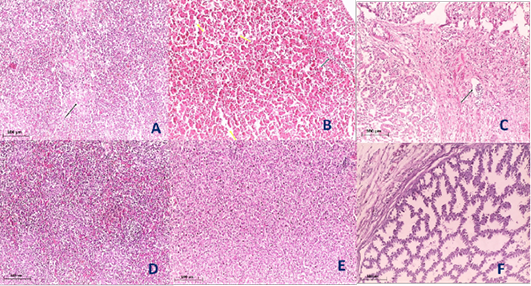 Histological section of spleen, liver and Proventriculus of the infected and non-infected group at 5th day post infection (dpi). A, spleen showed spleenitis with marked focal necrosis of lymphoid tissue (arrow); B, liver showed hepatitis with mononuclear cells infiltration (arrow) and dilatation of hepatic sinusoids (yellow arrow); C, Proventriculus suffered from moderate proventriculitis with mononuclear inflammatory cells infiltration within tunica muscularis (arrow) and epithelial cells degeneration; D, normal spleen (non-infected group) with no histopathological alterations; E, normal liver (non-infected group) with no histopathological alterations; F, normal Proventriculus (non-infected group) with no histopathological alterations.