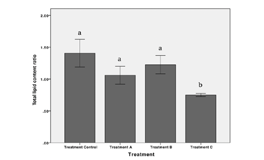 Total lipid content ratio between gonad and liver of female Nile Tilapia in each treatment *The different letters indicate significant differences (p < 0.05).