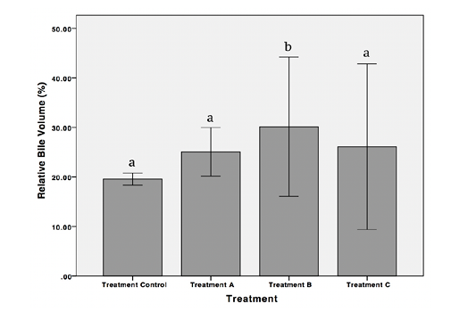Relative bile volume of female Nile Tilapia in each treatment *The different letters indicate significant differences (p < 0.05).