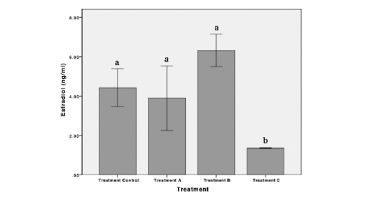 Concentration of estradiol hormone of female Nile Tilapia in each treatment. *The different letters indicate significant differences (p < 0.05).
