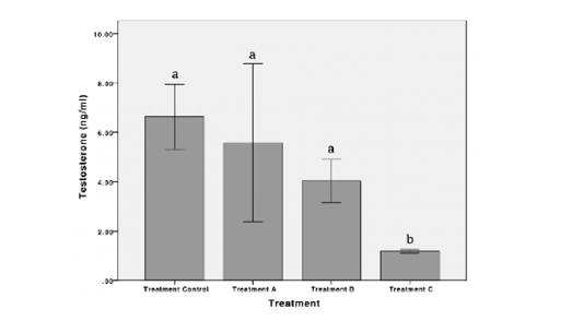 Concentration of testosterone hormone of female Nile Tilapia in each treatment. *The different letters indicate significant differences (p < 0.05).