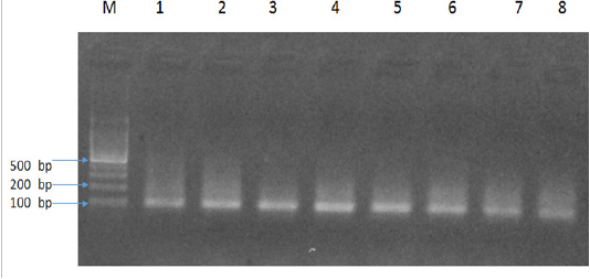 Amplicon (58bp) of gradient PCR targeting Babesia felis from blood samples.