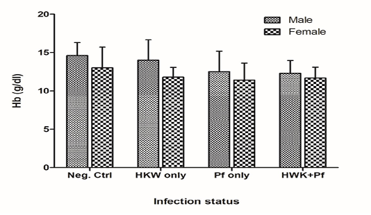Mean haemoglobin (Hb) levels among the different infection status groups at baseline survey. Neg. Ctrl: Endemic negative control; HWK: Hookworm; Pf: Plasmodium falciparum. Error bars represent the standard deviation of the mean.