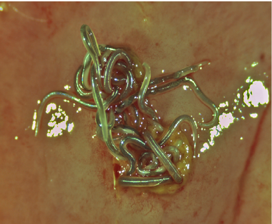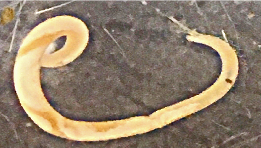 Superior view of a group of live Ortleppascaris antipini on a freshly excised portion of the stomach wall of Alligator mississippiensis. The nematodes are embedded in the mucosa at a focal nodule approximately 4 mm in diameter.