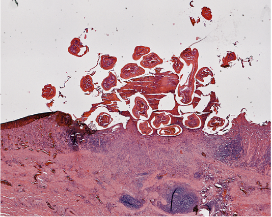 Section of the stomach wall of Alligator mississippiensis showing a lesion about 4 mm in diameter, housing multiple Ortleppascaris antipini.