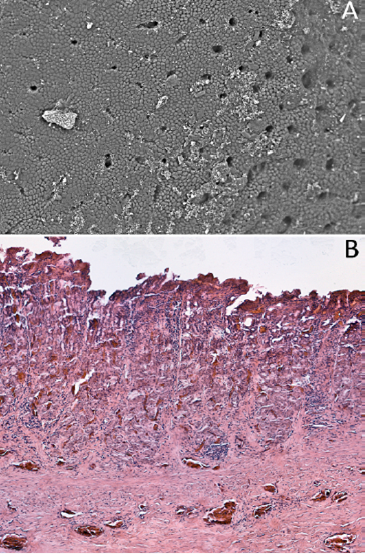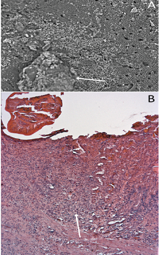 The influence of nematode infection on the gastric glands and pits of Alligator mississippiensis. A) Scanning electron micrograph showing the stomach wall of Alligator mississippiensis. The Ortleppascaris infection (arrow) has produced a central area of necrosis and a penumbra of mucosal damage; B) Section of the stomach wall of Alligator mississippiensis showing the loss of the gastric pits in the area of the Ortleppascaris invasion (arrow).