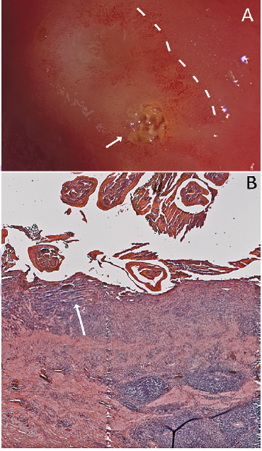 Mucosal response to the nematode invasion. A) Photograph of excised stomach wall of Alligator mississippiensis; the embedded Ortleppascaris have been removed from the lesion. The lesions (arrow, right) caused a penumbra of mucosal damage that was clearly visible (dashed lines); B) Section of the stomach wall of Alligator mississippiensis showing the gastric mucosa invaded with the Ortleppascaris. The parasites invaded the mucosa and submucosa, triggering a granulomatous inflammation response and a marked eosinophilic necrosis (arrow).