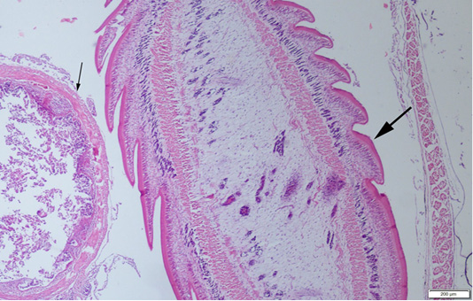 A plerocercoid (thick arrow) in abdominal cavity of the fish, near the intestine (thin arrow) of the host, HE, Bar=200µm.