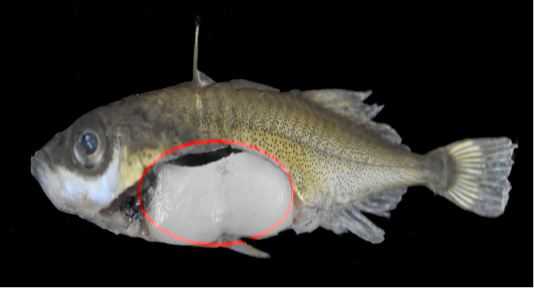 G. aculeatus individual infected with Schistocephalus solidus, 46.24 mm TL, May 2020 (S. solidus, circled in red.)