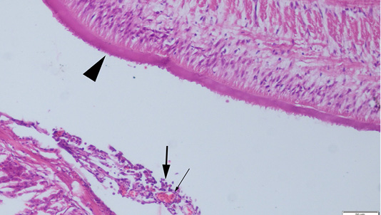Serosal surface of the fish intestine, hyperemia of the vessels (thin arrow) and inflammatory cell infiltration (thick arrows) near the plerocercoid (arrow head), HE, Bar=50µm.