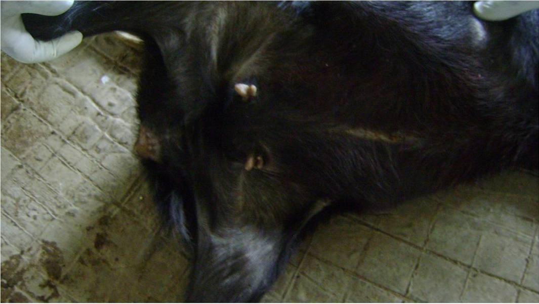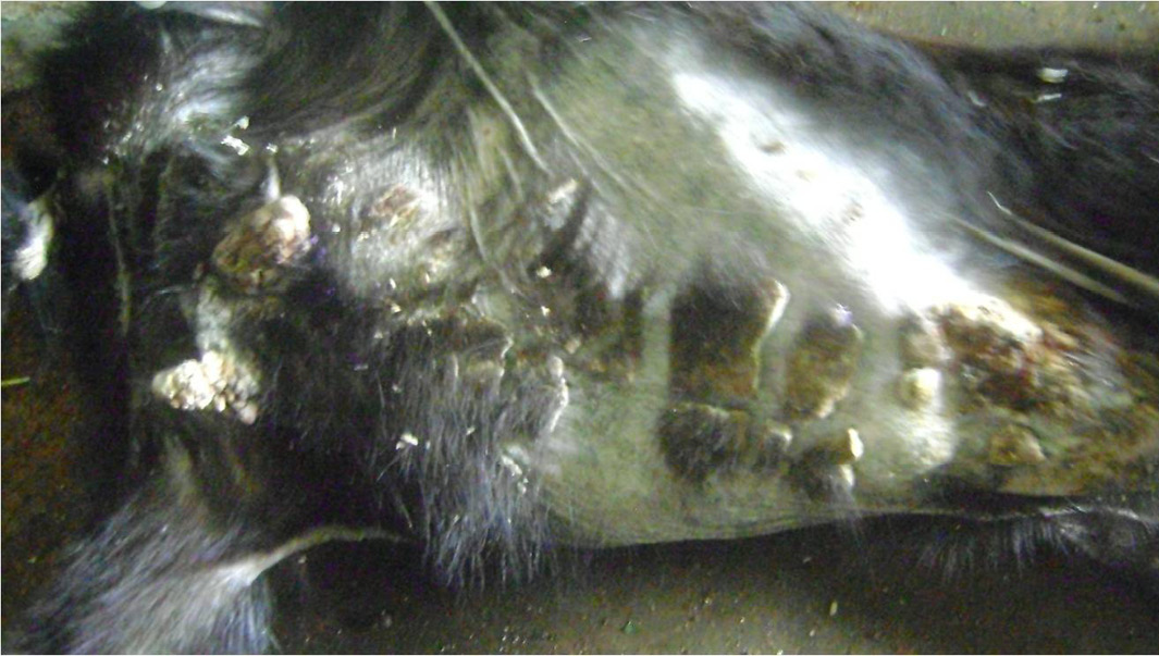 Breakage of heavy crust on the ventral abdomen and mammary gland region, skin thickening and wrinkling resolving after ivermectin treatment