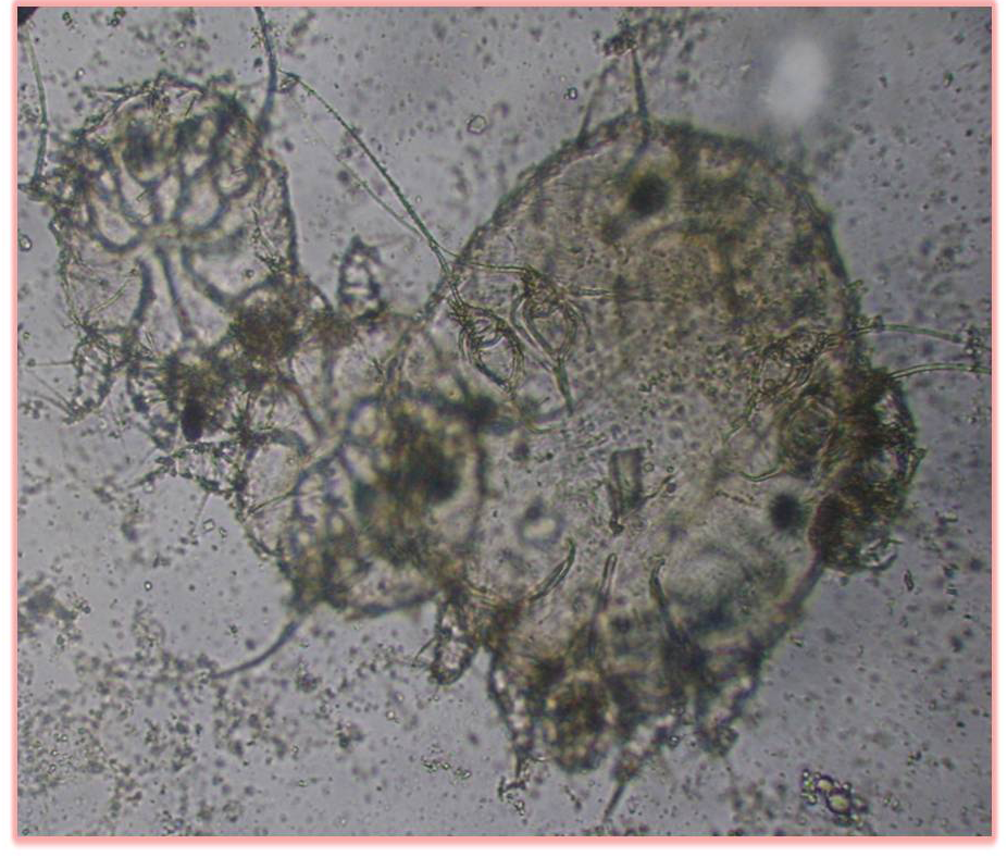 Heavy infestation before treatment with the female mite bearing long bristles on the third and fourth pair of legs while the male bears long bristle on the third pair of leg