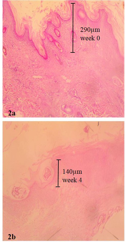 (b) showing mites in epidermis at week 4 of ivermectin treatment, epidermal tunnel height has reduced to 140microns haematoxylin and eosin stain