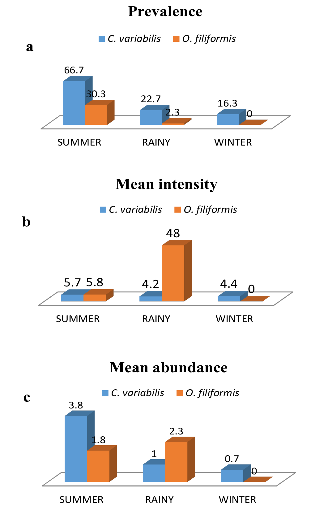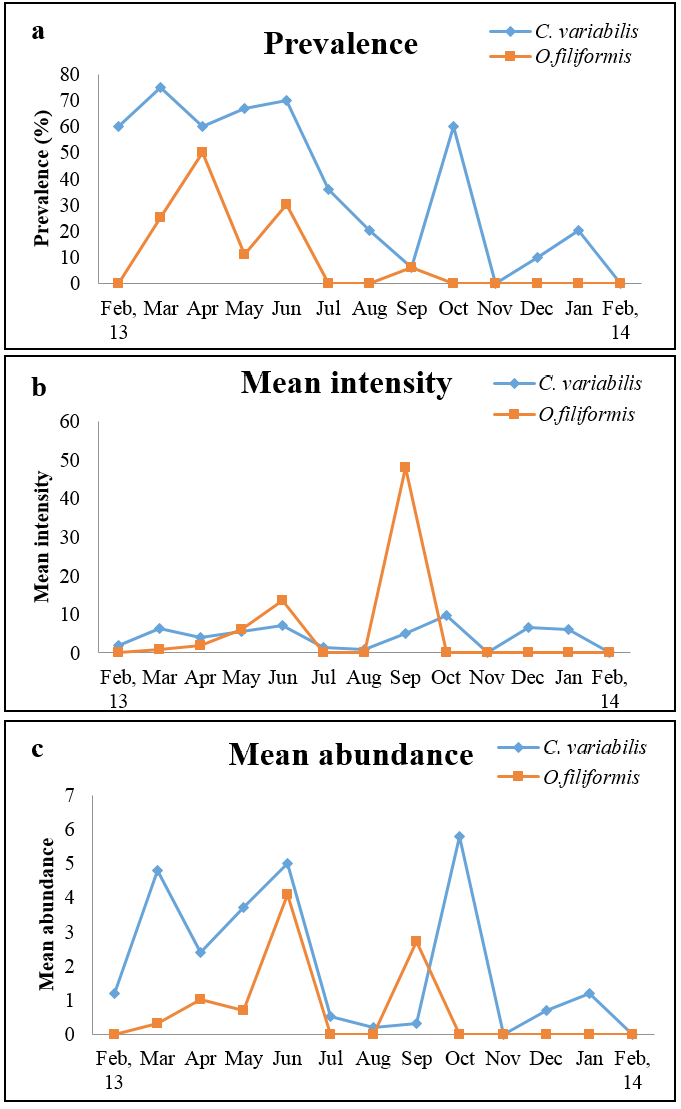 a) Prevalence; b) Mean intensity and c) Mean abundance